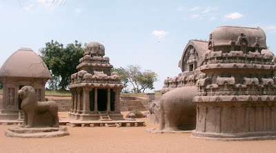 Mahabalipuram was a 7th century port city of the South Indian dynasty of the Pallavas around 60 km south from the city of Chennai in Tamil Nadu. It is believed to have been named after the Pallava king Mamalla. It has various historic monuments built largely between the 7th and the 9th century, and has been classified as a UNESCO World Heritage Site.The monuments are mostly rock-cut and monolithic, and constitute the early stages of Dravidian architecture wherein Buddhist elements of design are prominently visible. They are constituted by cave temples, monolithic rathas (chariots), sculpted reliefs and structural temples. The pillars are of the Dravidian order. The sculptures are excellent examples of Pallava art.
